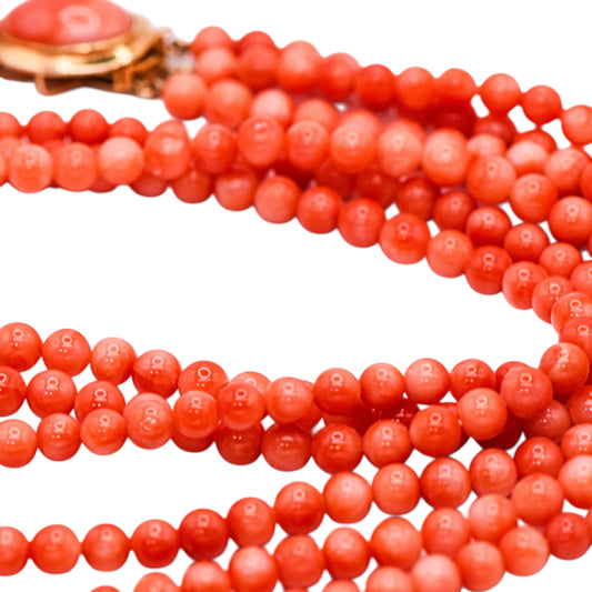 Estate Triple Strand Coral Necklace 14K Yellow Gold