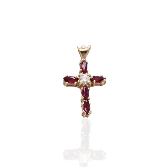 Ruby and Diamond Center Stone Bubble Cross Pendant 14K Yellow Gold