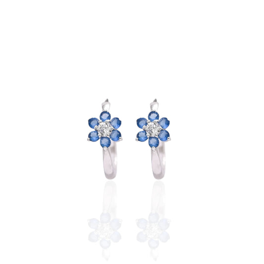 Blue and White Cubic Zirconias Flower Hoop Earrings 14K White Gold 1.90mm Thick/17.04mm Diameter