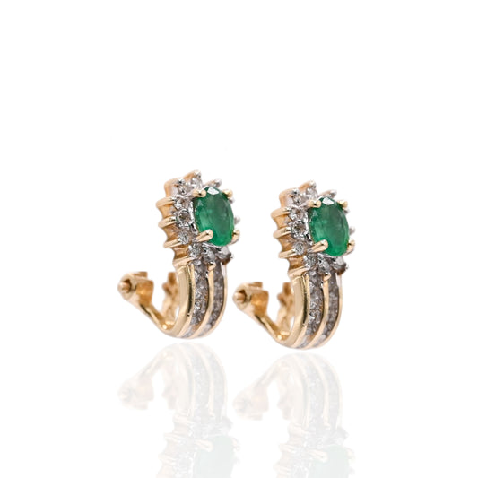 Emerald and Diamond Flower Omega Back Earrings 14K Yellow Gold 0.10cttw