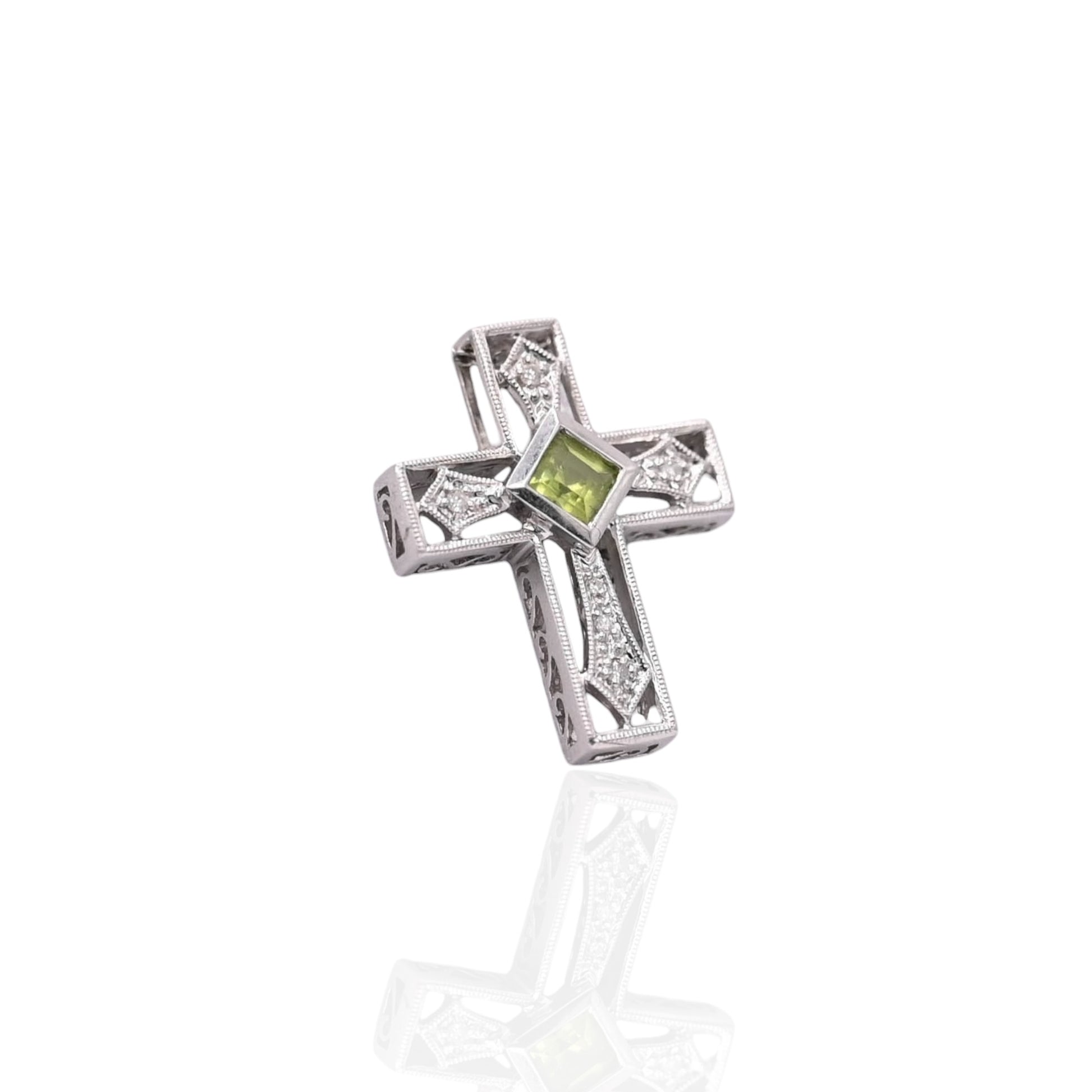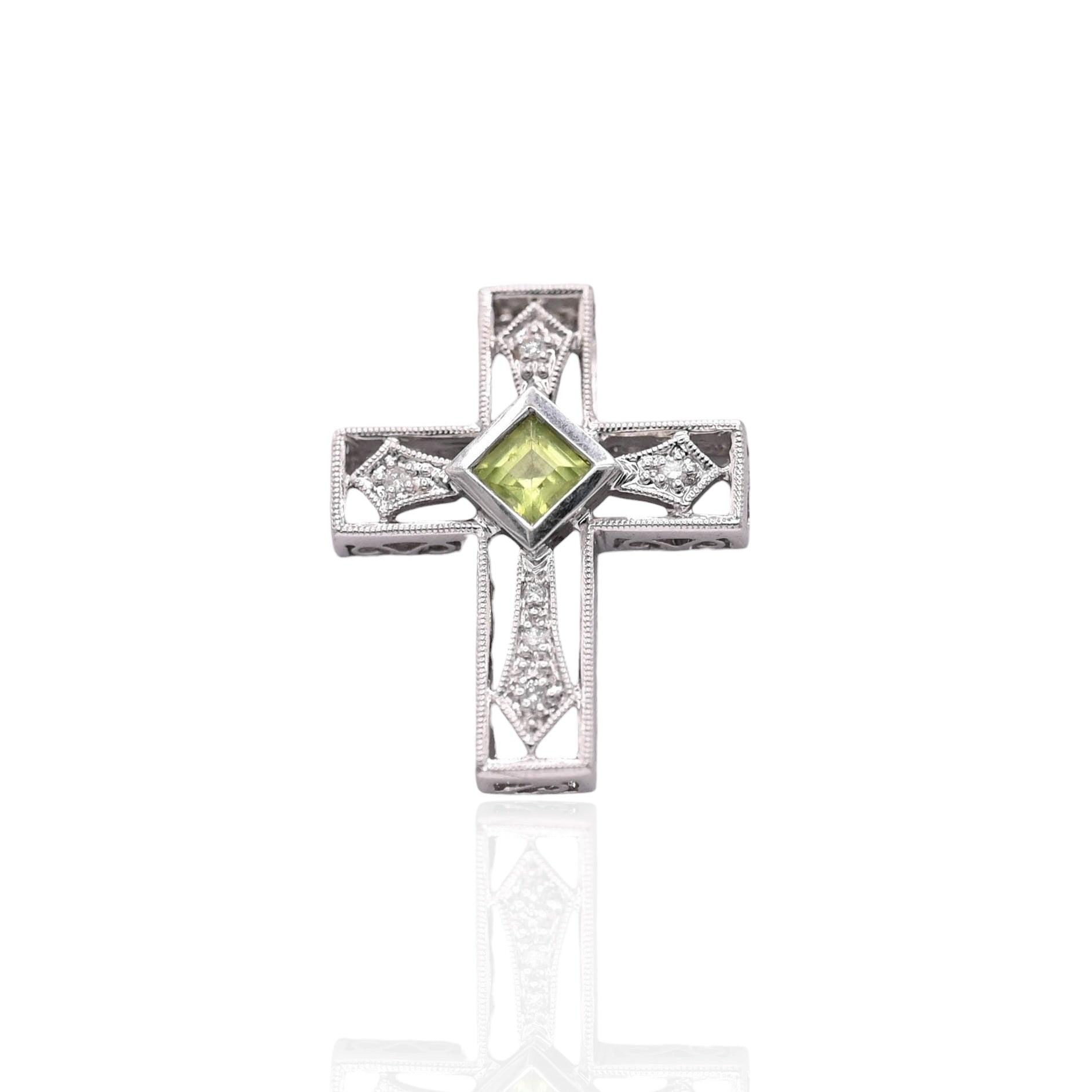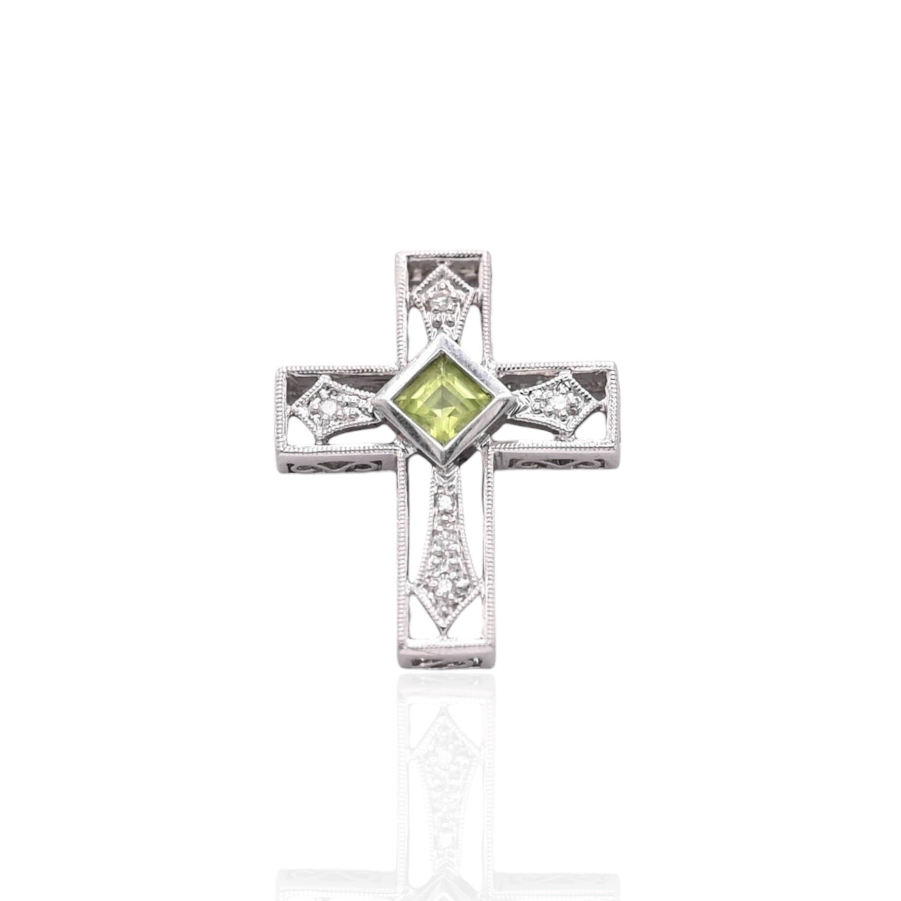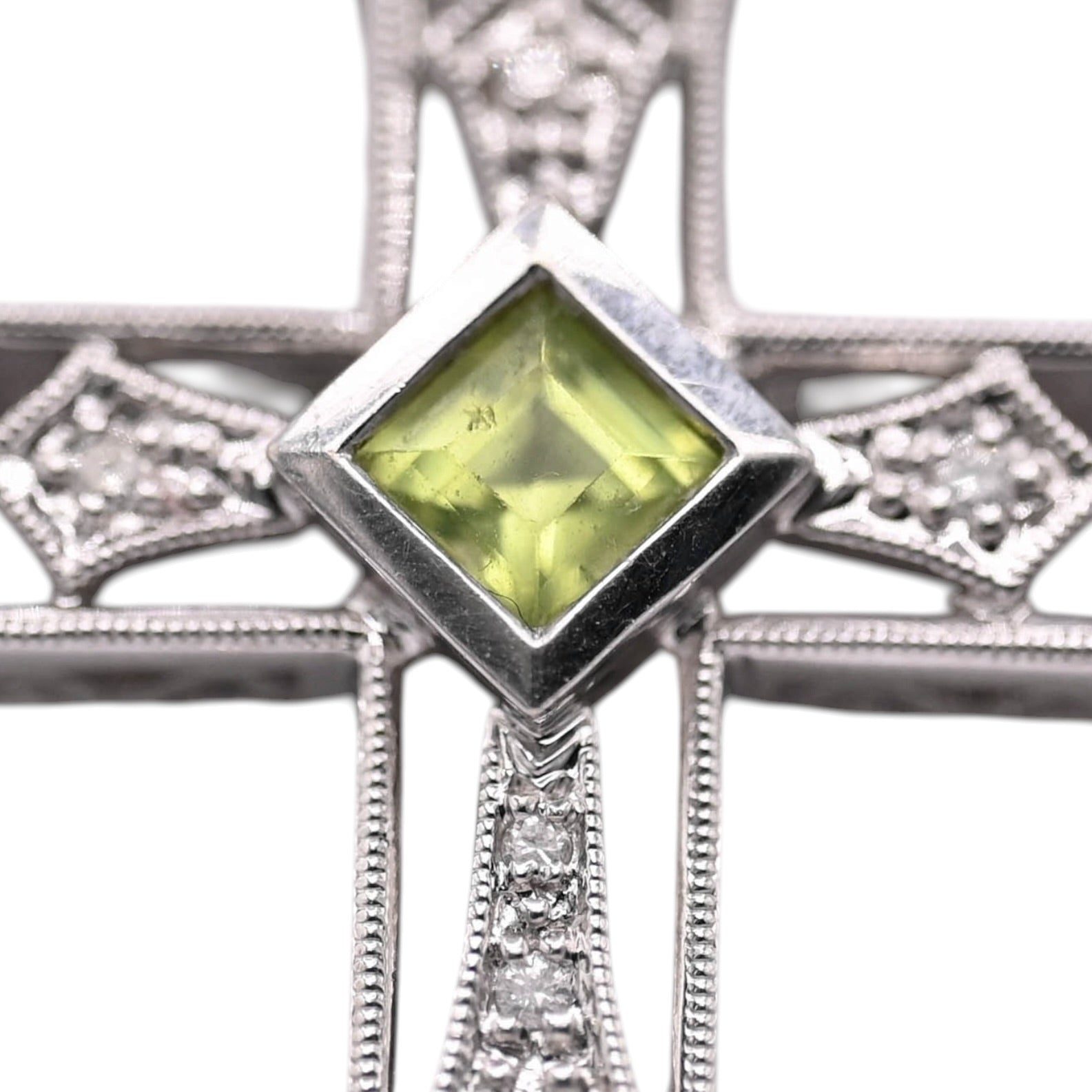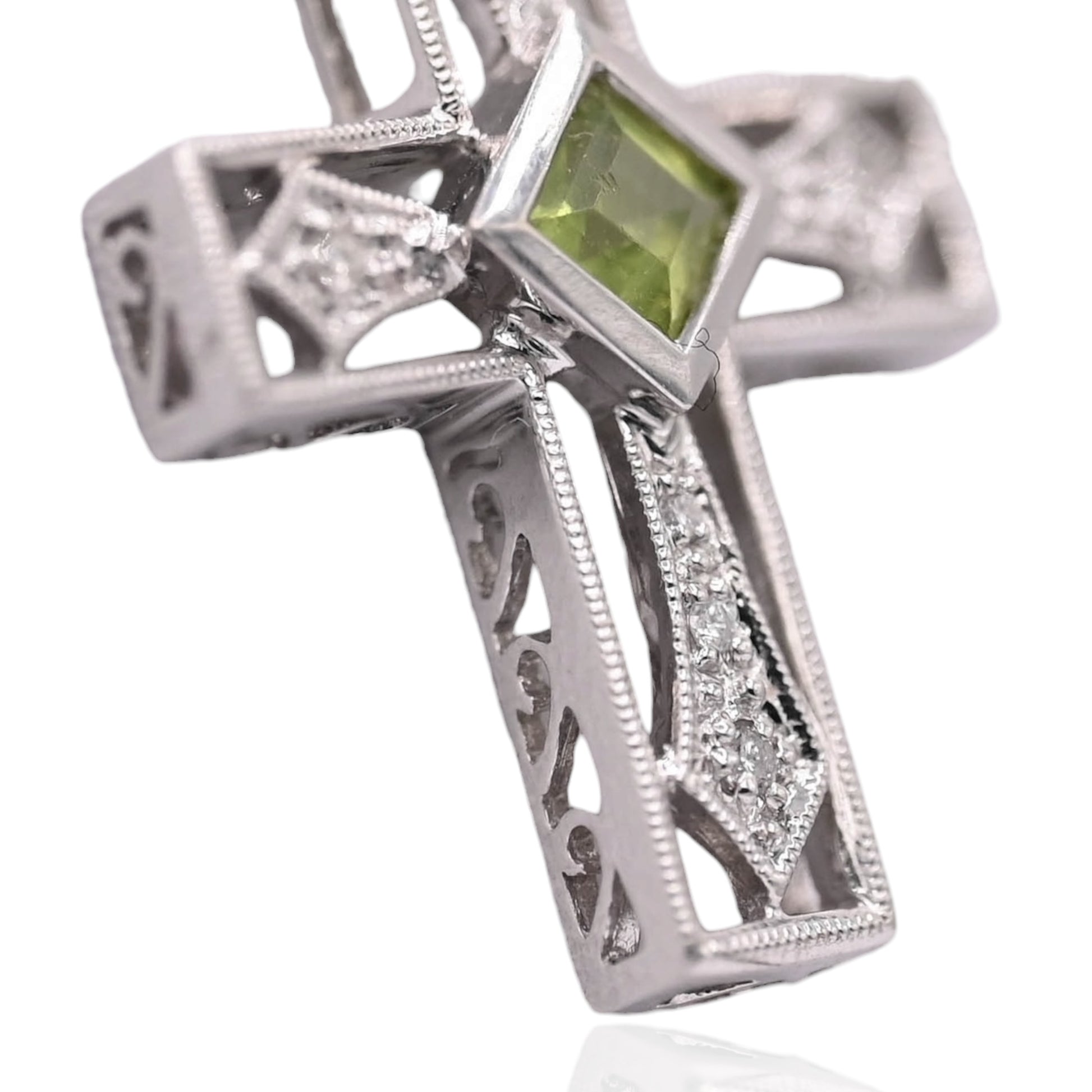 Ornate Peridot and Diamond Cross Slider Pendant 14K White Gold