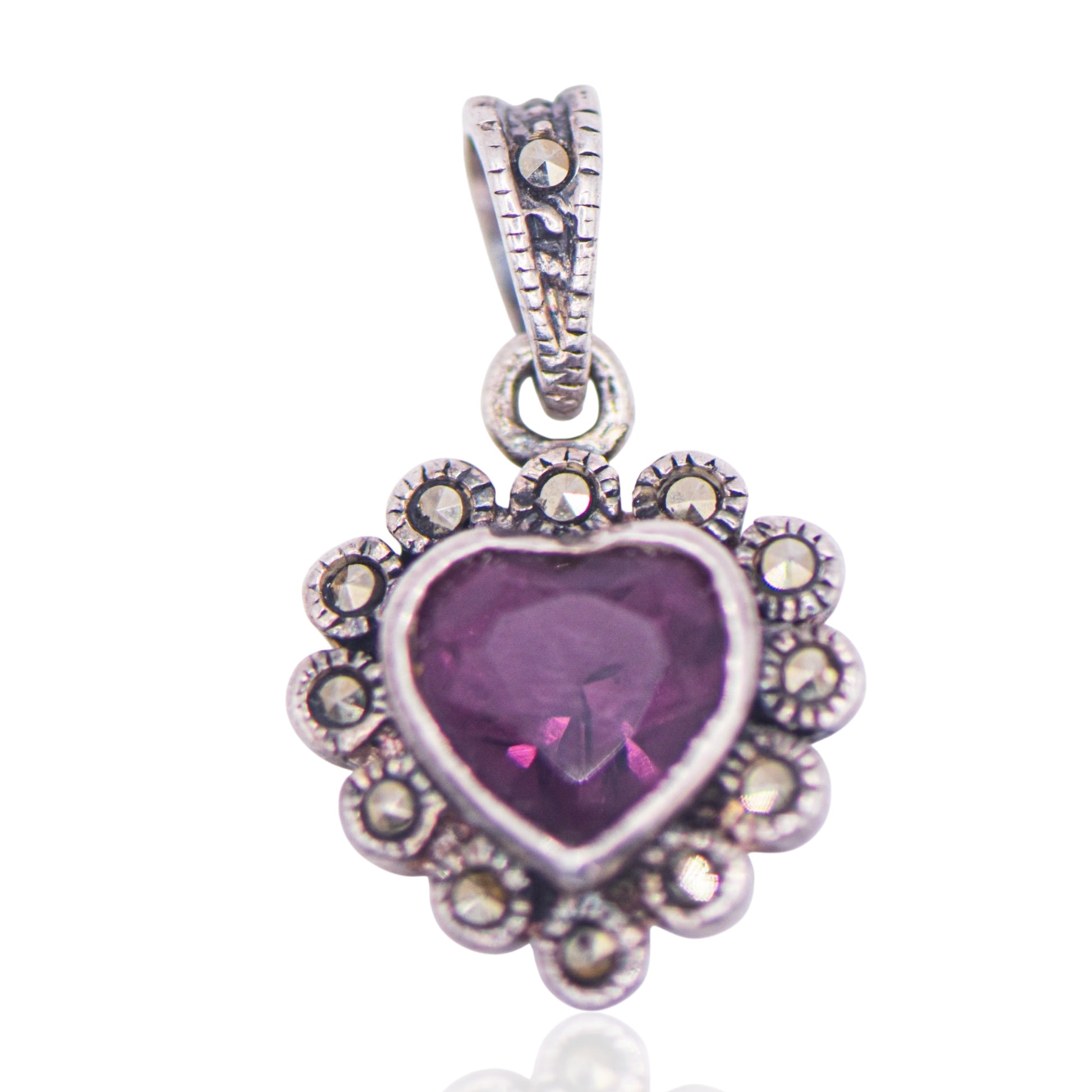 Vintage Heart Amethyst and Marcasite Sterling Silver Pendant