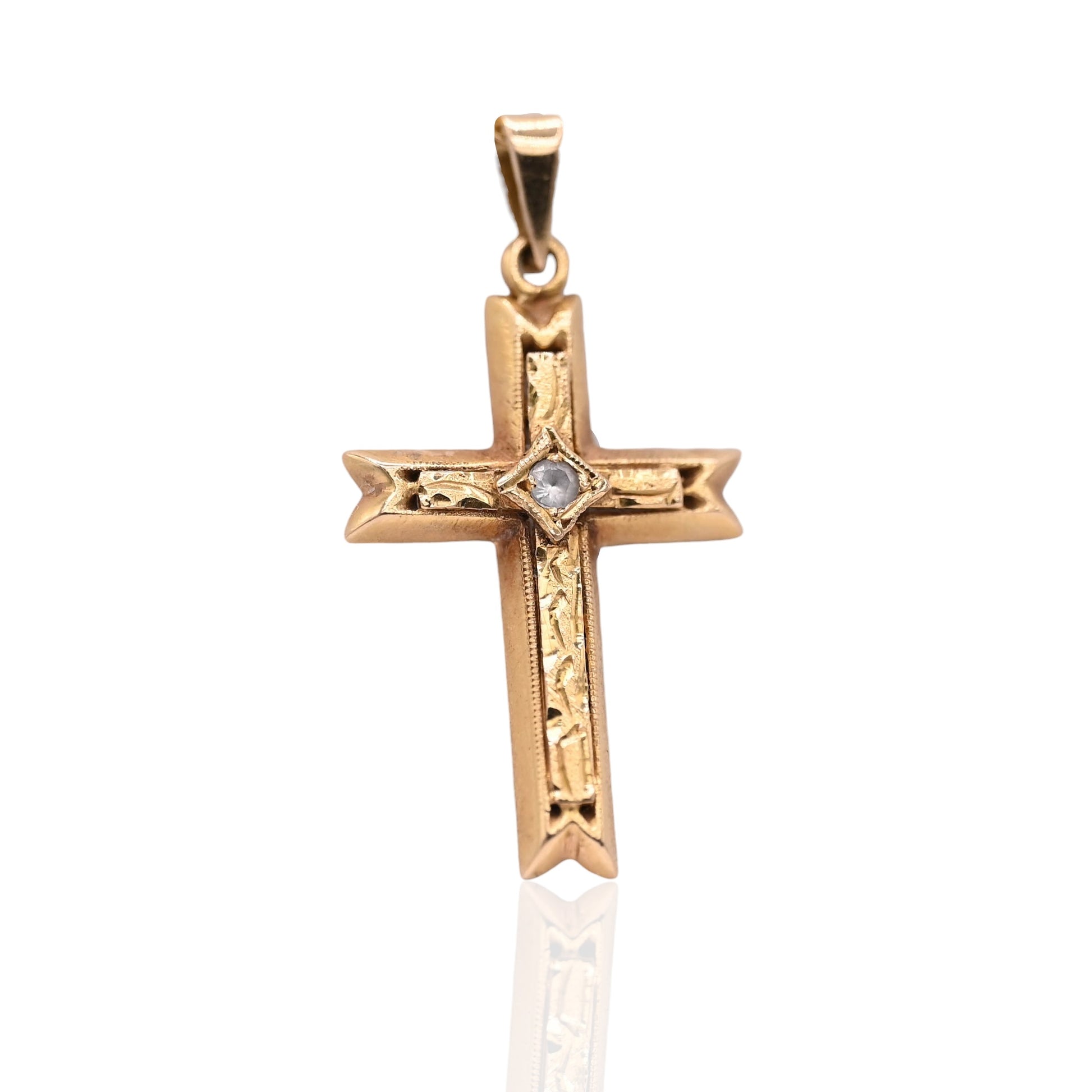Vintage-Inspired Ornate Cross Pendant with Center Cubic Zirconia 16K Yellow Gold